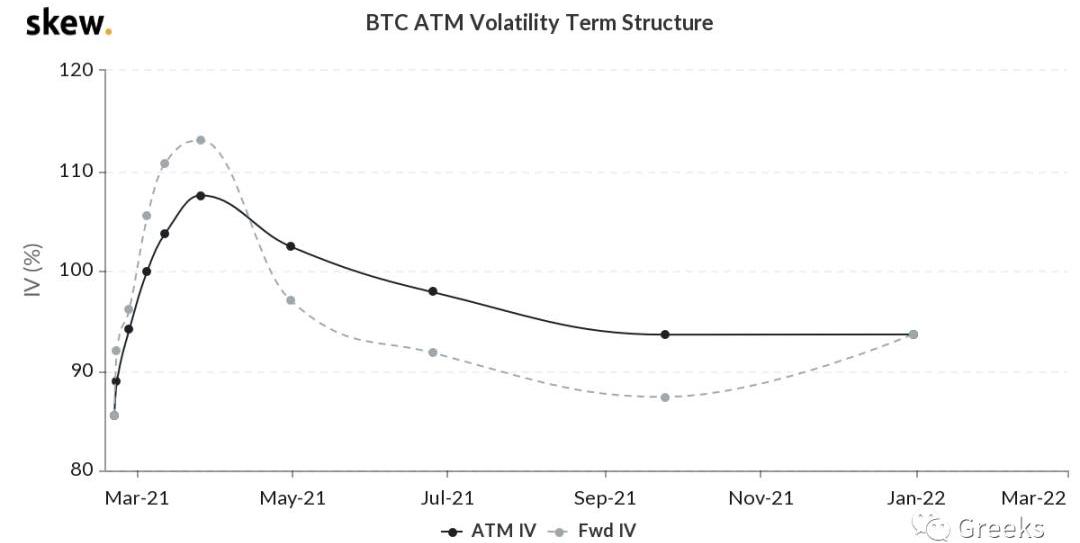 比特币在52000美元上方震荡,新高一触即发。今天又是周交割日,下一个大的交割日是2月交割,多重因素叠加起来,造成今天的大宗交易比较活跃。但是要注意,并非所有的大宗交易都是信号。播报数据由Greeks.live和Skew.com提供。BTC历史波动率10d125%30d107%90d91%1Y87%期权成交量5.7亿美元,目前持仓量为99亿美元。各标准化期限隐含波动率:今日:1m107%,3m101%,6m95%2/18:1m102%,3m97%,6m106%比特币IV相对稳定,目前市场热点在DeFi,主流币行情稳定,在牛市当中,节奏性很强。