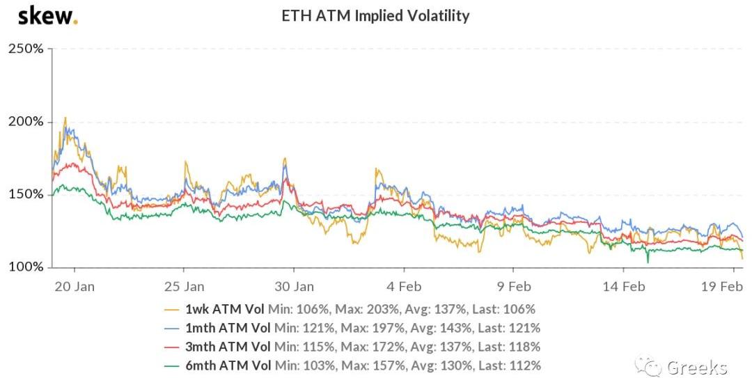 ETH历史波动率10d68%30d132%90d121%1Y113%以太坊今日期权成交量1.9亿美元,持仓量27亿美元。各标准化期限IV:今日:1m123%,3m118%,6m112%2/18:1m130%,3m121%,6m115%以太坊IV小幅下降,以太坊目前涨势和BTC很接近,前些日子DeFi以ETH为主要底层工具,而近几日BSC等新智能链成为了DeFi的主战场,ETH有所冷却。