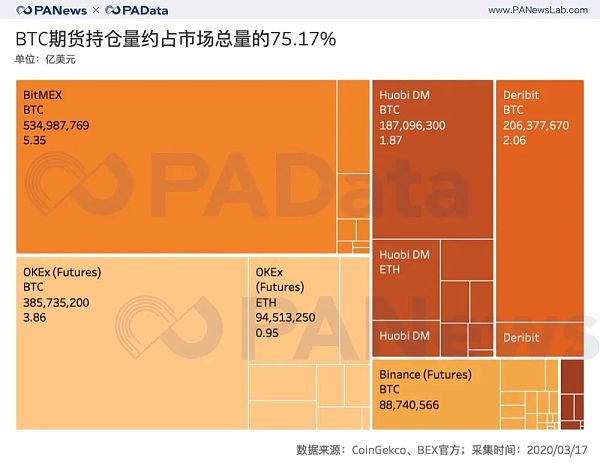 虽然交易量上涨了,但是近一个月受比特币突然下跌影响,持仓总额反而下跌了。3月17日的数据显示,28家交易所24小时未平仓头寸累计约24.12亿美元,而2月12日这一数值约为64.47亿美元,跌幅约为62.59%。其中BitMEX和OKEx的持仓量超过5亿美元,Binance和Deribit的持仓量均跌至3亿美元以下,BEX的持仓量约为1800万美元。