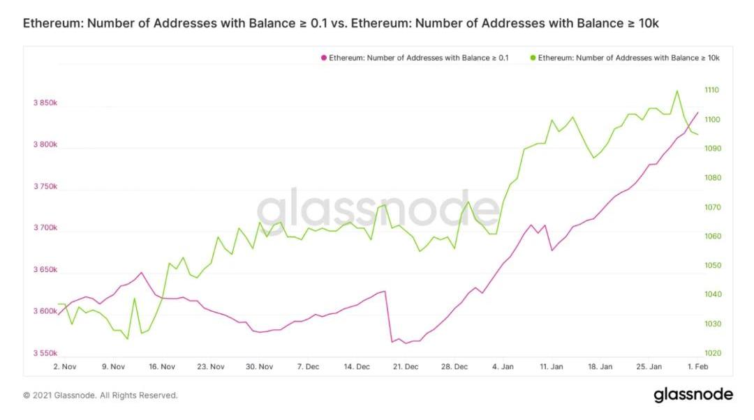 首先,这波涨势是散户和机构投资者越来越多地配置以太坊的结果。正如下面这张来自Glassnode的图表所示,自去年11月以来,持有0.1或以上ETH或1万个以上ETH的钱包数量稳步上升,几乎毫无阻力。