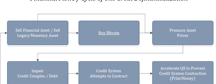 它可能始于最明显地高估的金融资产,例如负收益主权债务,但一切都将在砧板上。随着轮换发生,非比特币资产价格将承受下行压力,这同样将对这些资产支持的债务工具的价值造成下行压力。信贷需求将受到广泛削弱,这将导致整个信贷体系收缩。反过来,这将加速对量化宽松的需求,以帮助维持和支撑信贷市场,这将进一步加速金融资产向比特币的转移。由于金融资产价值之间的反馈循环,去金融化的过程将继续发展并加速发展,