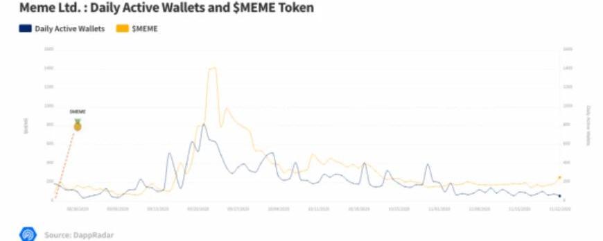 来源:DappRadar日活跃钱包数在10月达到峰值,为1449个,11月降至774个,而RARI代币价格降至2.34美元,与历史最高价9.75美元相比,下降了76%。另一个名为Meme.ltd的项目允许用户押注持有的MEME代币,每个钱包最多押注5个,用以挖掘限量版的NFT。如下图所示,Meme.ltd的日活跃钱包数在9月经历了最高峰,达818个,11月降至56个,而MEME代币价格下降到222美元,与历史最高价1414美元相比,下降了84%。