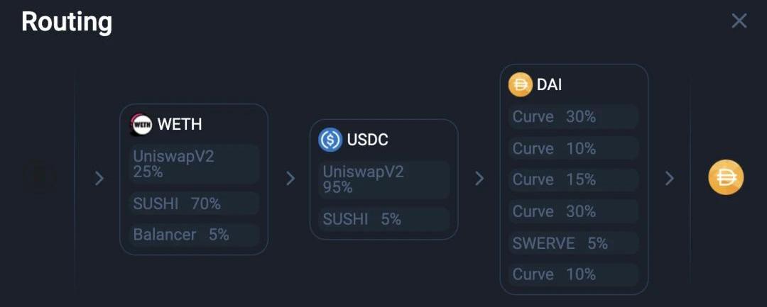 来源:https://www.theblockcrypto.com/data/decentralized-finance/dex-non-custodial/dex-aggregator-trade-volume1inch于2020年11月发布了v2版协议。相比于v1版,1inchv2版除了在用户界面、gas费优化、降低滑点和协议集成方面有重大改进之外,还发布了一项杀手级产品「PathfinderAPI」——这是一个全新的探索和路由算法,除了能在多个流动性协议之间「拆分」一笔代币兑换交易之外,还可有效利用同一协议中的众多「市场深度」,通过为用户实时优化交易路径,获得最优交易价格。「市场深度」,是根据公开买卖订单数量来衡量加密货币供求关系的一个重要指标。Pathfinder可根据不同「市场深度」为特定协议拆分一笔兑换交易,实现最佳买卖价格。在「源代币」和「目标代币」之间,它其实扮演了桥梁角色。以下图中「将33YFI兑换成DAI的一笔交易」为例,在整个兑换流程中,最后一步发生在curve平台的「将USDC兑换成DAI的一笔交易」中,我们看到,Pathfinder根据当时市场情况路由出多个不同的市场深度。