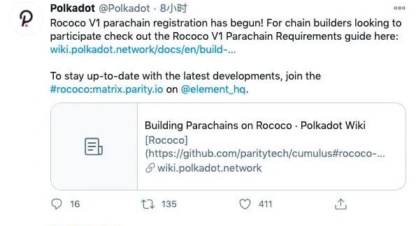 北京时间11月13日凌晨3:00左右,万众瞩目的波卡平行链开发工作再次迎来一大里程碑,平行链测试网RococoV1正式开放注册申请。