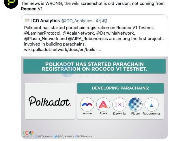 仅仅5个小时后,RococoV1之上的首条平行链诞生,二层扩容协议PlasmNetwork拔得头筹,成为了首条接入RococoV1测试网的平行链。尽管比预期时间稍微晚了两天,但头部项目的关键性进展显然足够吸引眼球,社区之内也是热议不断。Odaily星球日报留意到,早间曾有这样一则消息在各大社群内广泛流传——「参与RococoV1构建的首批项目包括LaminarProtocol、AcalaNetwork、Darwinia、Plasm以及Robonomics」。然而,波卡生态隐私项目PhalaNetwork则表示,该信息来自于波卡官方的Wiki百科截图,截图实际上是Rococo测试网的旧版本内容,并不是指这五家项目将作为首批项目参与RococoV1版本的测试。