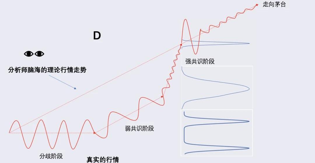 整个趋势的转变过程是这样的:一开始市场是有分歧的,但随着有实际证据不断证明这个金融分析师的理论模型是正确的,市场逐渐开始往一个方向偏离到弱共识阶段。随着共识不断加强,由双峰到单峰,价格不断震荡向上,波动率从高到低。最后加速阶段产生泡沫崩溃,崩溃以后如果共识还是很强,那就有可能走茅台线。