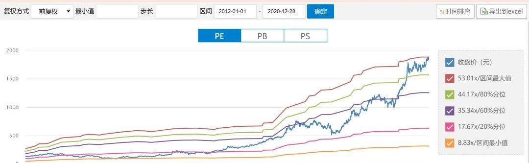 按照冯柳老师的说法,右半部分的TV就叫终局思考。TV的判断要求投资者有很强的认知能力,靠逻辑对人性、商业模式、行业趋势、科技进步乃至的理解,去判断一个公司或者一个行业未来应该是什么一个形态。最近很流行的所谓长期主义其实就是指这个。TV主要在两个类型的公司对估值起到了很大的作用:1)确定性的方向:高景气赛道股,核心是变2)确定性的业绩:核心成长股,核心是不变确定性方向:高景气赛道高景气赛道,刚才提到的特斯拉的例子,一句“软件定义汽车”,用户付费之后,特斯拉公司能直接OTA在线升级解锁硬件功能,还能通过OTA的来规避大规模召回的问题。边际成本近乎为0,极大地改善了利润能力。这对汽车行业来说带来了全新的商业模式,对于这种“终局”,大家都知道空间很大,实现概率很高,也都知道届时具体的利润业绩现在是拍脑袋拍不清楚的,反正大就对了。同时大家还知道现在的价格用P系算法是解释不了的。但依旧想上车怎么办呢?还是得买单甚至溢价支付咯,一般大家都把这种称之为格局票。这种终局的认知能力,对于一级市场特别是VC是必须点出来的科技树。只是随着IPO越来越简单,很多公司实现价值的时间段放在了二级市场。所以二级市场投资也开始需要点这个科技树。这里的终局,也并不是死板的指几十年后情况,而是指一个技术变革或者商业模式变革以后的业态。这也是之前提到的,公式的左半部分和右半部分的界限划分是主观的。所以,第一类TV,核心关键词是“变”。变,导致巨大的想象空间,让投资者愿意为未来潜在的巨大空间买单,为公式的右半边买单。确定性业绩:核心成长股为什么P系模型只用到了模型左边呢?是因为大家拍不清楚太未来的业绩。但如果更远未来的业绩可以拍脑袋拍清楚呢?还是拿经典的茅台举例子。现在茅台一股接近1900的价格已经超过了1499的出厂价,而PE也到了50左右,可以说挺高的了。从历史估值来看,也到了区间最大值了。