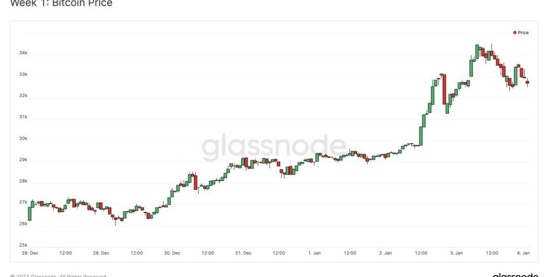 比特币在新年期间又度过了令人印象深刻的一周,达到历史新高,首次突破3万美元。本周开盘价为26270美元,之后继续上涨,达到34550美元的高点,之后略有回落,本周收于32685美元。