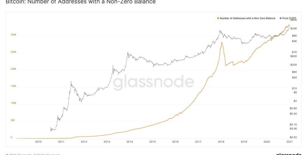随着比特币价格的持续上涨,大量的散户对比特币的兴趣也在增加,持有非零比特币数量的地址数量达到了历史最高水平,超过3300万个。