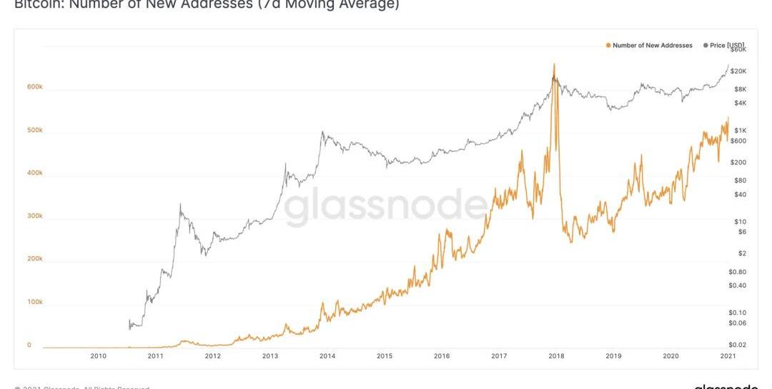 然而,尽管新闻报道和散户对比特币的兴趣正在迅速增长,但每日新比特币地址的数量仍未达到2017年的水平。该指标的稳定和持续增长表明,比特币的应用正在经历强劲的有机增长,但不是典型的泡沫病式增长。