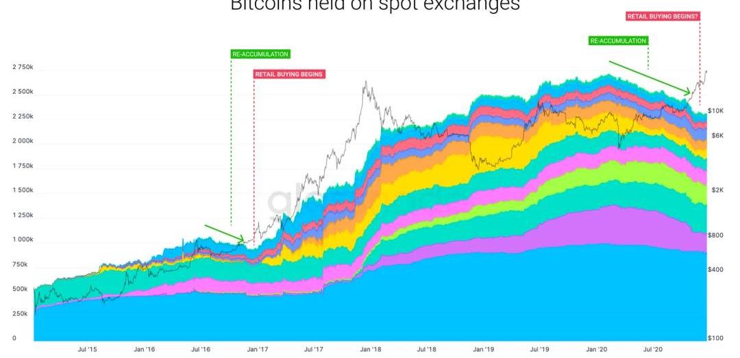 WillyWoo的观点:从长远来看,外汇储备结构预示着未来一年将是一个好年份。现货交易所的储备枯竭已停止,这意味着宏观周期的再积累阶段可能已经结束。下面的图表通过现货储备的角度显示了我们在整个宏观周期中的位置。