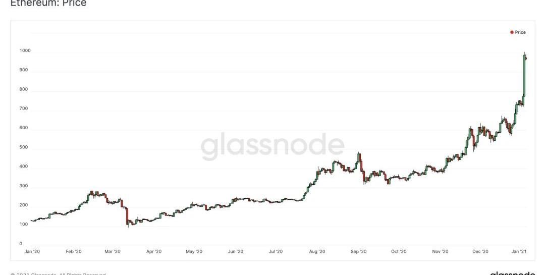 ETH在周日的牛市行情中,单日涨幅超过37%,突破1000美元大关,与去年同期相比上涨了近7500%,当时的价格低于140美元。