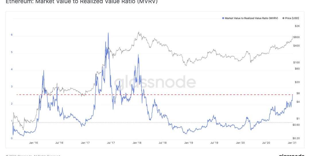 ETH上一次达到这个价格是在3年前,也就是2018年1月,当时它花了不到一个月的时间在1000美元以上,然后又回落到三位数。然而,链上信号表明,相对于2018年的价格水平,我们仍处于牛市的早期阶段。例如,它的MVRV比率相对于2018年初仍然非常低,当时的价格与当前水平相当。