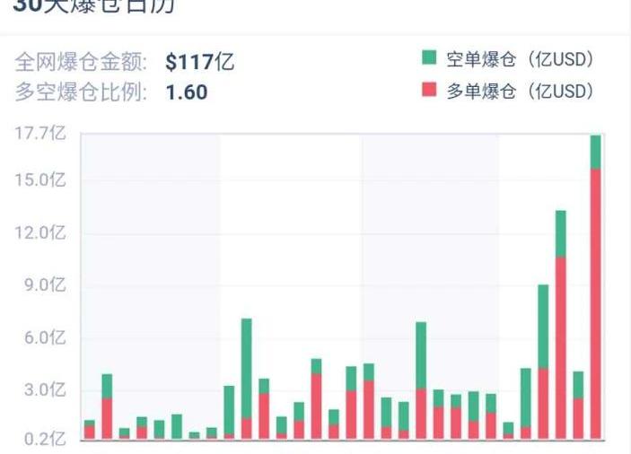 这是本月发生的第二次爆仓额超过100亿的日子,在1月4日,当日比特币短暂暴跌5000刀,100亿资金灰飞烟灭。今天,也一举创下近30日爆仓新高。其中多单爆仓超过15亿美金,空单爆仓将近2亿美金。