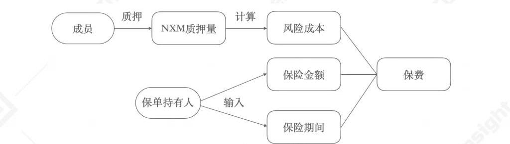 传统保险行业中:保单持有人:购买保险以对保险标的进行投保的主体;保险人:承担保险保单的赔付责任的主体;承保:承担规定的保险责任的行为,通常由保险公司担任这个角色。在DeFi保险项目中,项目方仅作为面向双方的服务平台,保险人和保单持有人都由平台的用户承担,双方根据交易的不同策略作区分。DeFi保险项目类似于传统保险业中的财产保险。以财产作为保险标的,对标的资产可能发生的经济损失进行保护。不同点在于,财产保险以房屋保险为例,保单持有人一般为房屋所有者或者使用者。DeFi保险项目中,大多数情况下参与者无需持有“标的资产”,即可购买相应保险产品并在遭受攻击时申请赔付。例如,用户未参与PickleFinance合约,但在Cover购买了PickleFinance保险产品,赔付评估通过后可享有相应赔付。NexusMutual是目前承保金额最大的DeFi保险平台,截至2020年12月15日,总承保金额为5,509万美元,提供65个项目的保险产品。由于实体公司的要求,用户需要填写标准的KYC/AML流程。NexusMutual采用共保模式,与传统共同保险公司类似,收集保单持有者资金,会员形成共同体以分担风险,并共享保费收益。用户购买NexusMutual代币NXM并成为其会员,拥有治理投票权,通过质押NXM参与索赔的评估;购买NXM的资金注入资金池用于保险赔付。因此NexusMutual并无明确的保险人进行担保,所有成员共同享有所有决定包括索赔评估的投票权同时承担赔付责任。共同体持有的资金量,即资金池用于保险赔付,资金池中资金一方面来自于保险人购买NXM资金的直接注入,另一方面保单持有人购买保单的资金的50%将注入资金池。NexusMutual保单的价格模型根据风险成本、保险金额以及保险期间设计: