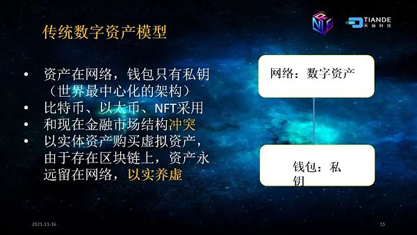 以太坊、比特币的整个市场结构跟我们现在金融系统机构是有冲突。假如你的账户有一百万,准备到银行把一百万人民币拿出来,没有哪一家银行敢说“不行,你只是拥有钥匙,钱永远放在银行里面”?所以,可以看出这是有冲突的。在这种情况下,谁拥有最多比特币或以太币,谁就是全世界最有钱的人,这也就是为什么他们的市值增长这么快。但以太币只存在于以太坊上,说白了这就是“以实养虚”。我们自己买来买去,买了半天看谁最有钱,结果还是发行比特币和以太币的人最有钱。我们拿自己的钱养肥了以太坊、养肥了比特币,这就是以实养虚。这就是传统数字资产模型。