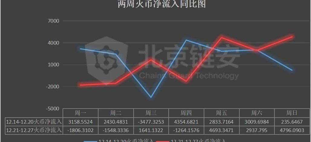 从数据来看,本周币安的比特币流入和流出本无太大变化,同样是在周日的币价刺激下,引发交易活跃,充币行为明显增加,与此同时币安的比特币流出明显减少,结果就是币安的比特币净流入,本周强势从负数转向大幅净流入1.6万余枚比特币。火币交易所BTC流向数据流入:12.14-12.20:43766.9312.21-12.27:46922.06较之前一周上涨:7.21%详细数据图如下: