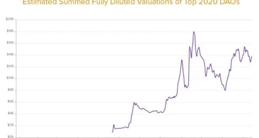 资料来源:CoinGecko,使用市值排名前150的代币作为起始清单,估算所有在2020年完全启动的DAO项目总摊薄市值。本文提供的图表信息仅供参考,每个人做出任何投资决策的时候不应该依赖于这些图表,因为过去的市场表现并不能预示未来结果「去中心化自治组织」的概念已经存在了一段时间,但是2020年应该是这一概念蓬勃发展的第一年。从数据上来看,今年排名前12位的全新去中心化自治组织的总摊薄市值约为140亿美元。DAO确实很有趣,不仅因为它们现在市值越来越大,更重要的是,去中心化自治组织已经成为一种新型机构。人们需要在网上聚集在一起讨论和投票来对软件进行改变,过去这种事情只能通过线下投票才能解决,但现在情况已经不同了,人们可以更新协议、改变参数,因为他们都是去中心化自治组织的一部分,有些人通过付费加入组织,有些人则通过其他贡献获得份额。这些新DAO是收费的,他们有明确的盈利计划。2018年和2019年,人们谈论最多的事情就是加密资产没有基本面支持,因此难以定价。但现在,如果你关注一些顶级去中心化自治组织,就会发现他们都具有很强的基本面支撑。另一方面,基于完全摊薄市值,DAO能够获取的潜在或实际的协议费用有多少?对于这个问题,你可以使用纯链上数据进行计算。但需要注意的是,DAO不是公司,更不能用「公司」的方式来看待、评估DAO——对于这些实体来说,「代码即法律」,世界上任何人都可以加入其中,或是成为其中一部分,DAO没有员工或办公室,只有社区、贡献者和软件。DAO是协议,的确如此,但同时DAO又不仅仅是协议,因为DAO已经民主化了,受自己社区的支配。社区里的每一个人都对DAO抱有预期,他们有投票权力并拥有DAO,社区成员大多从未见过,但他们却可以很好地合作并共同开发系统,这些系统中持有和转移的代币价值可能高达数十亿美元。过去人们总是想给社区拥有和运营的软件起个名字,好吧,这个名字就是DAO,DAO可以充分表达这层含义,也是一种当前存在的全新组织结构。