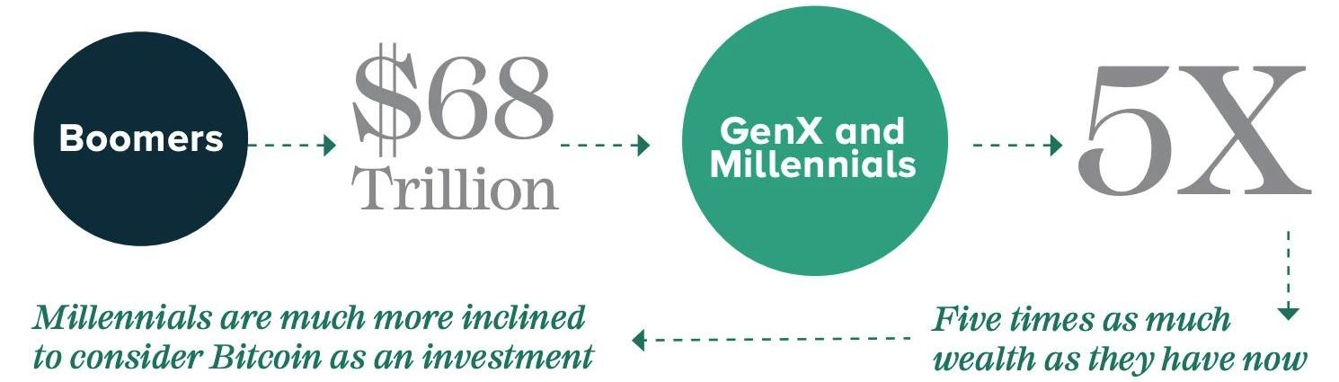 在后疫情时代,比特币会得到更多投资者的青睐,实现其价格的上涨。有多种因素正推动比特币实现这一进程:第一,在评估比特币投资产品的总体市场机会时,人口画像分析是一个重要的因素。根据样本调查显示,接受教育程度越高的人,越容易接受这种新兴资产的出现,他们更容易理解背后的原理和未来的发展潜力;相较于女性投资者,更多男性会敢于尝试投资比特币,而年轻人比年长的人也更愿意投资比特币。虽然老年投资者,目前比年轻投资者持有更多的财富,但年轻投资者将从老一辈继承大量的财富,因此在未来几十年内,68万亿美元将从40后传给60后,甚至到千禧一代。当到2030年时,千禧一代的投资规模将是现在的五倍。而依据上文提到的调查结果,年轻人比年长的人更容易接受并投资加密货币,这些从老一辈继承到的财富,也会有相当一部分被投资于比特币等一些新兴资产,进而推高比特币的价格。