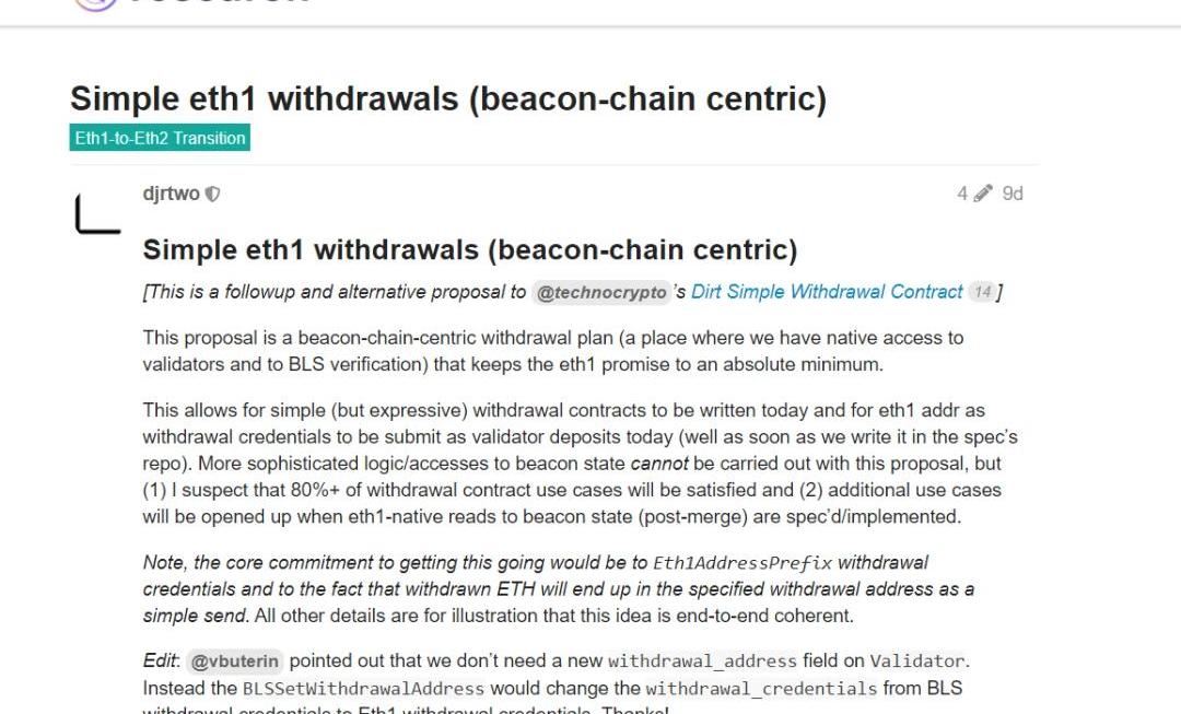 WhilePhase0marksthestartofETHstaking,RocketPoolwillbechoosingtolaunchfollowingtheimplementationofsmartcontractwithdrawals,toadheretothenon-custodial,trustlessnatureofthestakingsolutionwesetouttobuildovertwoyearsback.ThisisexpectedinQ1of2021andwe’llhopetolaunchalongsideit.RocketPool的打算是在ETH2.0开启智能合约取款之后再启动,以实现非托管的服务方案,并表示预计将在21年第一季度实现。为什么RocketPool认为21年第一季度就能够实现取款?因为最近以太坊社区有一个关于使用简单的方式提前上线取款功能的提案,如果提案通过就有可能加快ETH2.0的取款进度。