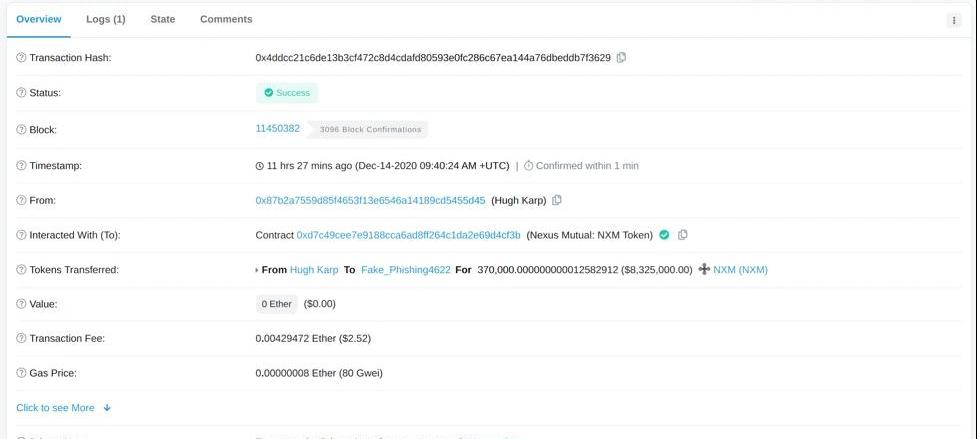 北京时间12月14日晚5点40分,CertiKSkynet天网监控发现一笔来自NexusMutual创始者HughKarp账户的巨额交易,该交易转移共37万NXM代币到不明账户中。CertiK安全验证团队迅速展开调查分析,认为该次交易是针对HughKarp账户的黑客攻击。顺便给大家计算了一下37万NXM=833万美金