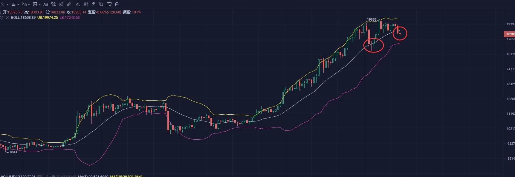 但也不可忽视掉前段时间上涨过快,倾斜角度过大的原因,而近期由于震荡,Boll带已经由上斜逐渐转平,所以中轨的象征性并没有前期那么强。再者,从Boll上看,行情接下来的支撑是在17200附近,但从MA均线上看并非如此。此前行情回调16000美元时,在MA上刚好踩到30日均线上,而此次回调刚好也是在30日均线附近,前一次支撑既然有效的话,当前也可以期待一下。