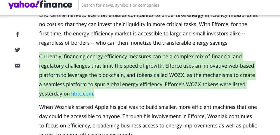 Efforce的诞生,并未偶然。作为苹果的联合创始人,沃兹的一生,都在致力于提高效率,节约能源与成本。1976年AppleI的诞生,是沃兹理想实践的第一步,此后的他一直专注苹果设备的效率的提升和节能工作。2019年,沃兹重新出发,入局能源行业,他与朋友创立了Efforce,试图通过区块链技术颠覆能源效率市场,提升资源利用率。这也是自苹果公司之后,沃兹唯一一次以联合创始人身份参与的公司。区块链+节能=Efforce从市场前景来看,在过去的十年中,全球能源效率市场规模约为2410亿美元,并且每年以10%的速度增长,增长潜力非常大。并且,节能领域项目平均回报率在20%以上。然而,对于投资者而言,按照监管的规定至少要投入100万美元才能参与节能项目。这直接限制了普通投资者的进入,同样也限制了小型企业募资渠道;另外,项目信息的不透明,也使得投资人对标的进展缺乏信任。由于种种限制,节能领域始终未能进一步扩大规模。"全世界的能源消耗和二氧化碳排放量成倍增长,导致气候变化和对环境的极端后果。我们可以在不改变习惯的情况下,改善我们的能源足迹,降低能源消耗。我们只需进行更多的能源改进,就能拯救环境。"沃兹介绍自己创立Efforce的初衷。"Efforce是第一个去中心化的平台,让每个人都能参与全球范围内的能效项目并从中获得经济利益,并创造有意义的环境变化。"对企业端来说,Efforce将区块链技术与物联网相结合。当节能项目实施时,企业所节省的能源将通过Efforce架构进行跟踪,并上传到区块链,不可篡改;企业根据节能贡献获得WOZX代币,直接从节能中受益。对投资者而言,Efforce将区块链与金融结合。其持有对公众募资牌照,通过Efforce平台让更多人参与能源节约项目。能源服务公司首先注册一个能源效率项目,由Efforce团队验证;Efforce与能源服务公司一起开发项目,包括评估投资需求、计算预期回报并制定一份能源绩效合同,详细说明公司和投资者的节能和回报期限;然后,平台会列出项目供投资者选择,参与者可以使用WOZX代币投资项目,未来获得回报。通过使用Efforce平台,能源服务公司融资的过程得到了简化,拓展了融资渠道。首发霍比特HBTC,财富效应突出作为首个基于区块链的节能平台,以及沃兹的名气加持,Efforce去年诞生后便备受关注。经过一年的沉寂与研发,Efforce近期重新亮相。12月2日,Efforce官方发文表示,旗下代币WOZX将于12月3日上线霍比特交易所。作为沃兹的第二个项目,雅虎财经也第一时间报道了Efforce的上线动态。