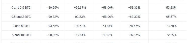 每月每个交易区间的净买入或卖出行为。来源:OKEx上表显示了整个8月份所有交易区间的大量净卖出。这可以解释为,8月份是比特币在近12个月后首次突破11000美元的价格区间,投资者急于获利回吐。9月份的主要特点是比特币再次跌至1万美元,随后又在1万美元至1.1万美元之间盘整。虽然我们看到本月散户买盘,但所有其他区间都是净卖出——除了10BTC或以上区间的投资者,他们是中性的。10月标志着比特币又一次上涨,从10500美元升至13500美元。虽然散户预期会加入这一行列,但这也动摇了专业交易员。尽管大户和巨鲸仍然是净卖家,但他们在10月份的抛售并不像前几个月那样极端。值得注意的是,10个BTC或以上区间的投资者也在10月成为净买家。最后,11月,散户和专业交易员继续买入,而大户、巨鲸和投资机构获利回吐。这种行为可以解释为比特币在2017年11月25日首次尝试创下历史新高,但没有成功,结果导致股价暴跌,并在感恩节前后崩溃。这里的心理阻力,以及风险管理的需要,可能促使巨鲸和机构在这些水平上放松仓位,而散户和专业交易员仍抱有希望。从长远来看,我们将考虑11月的最后一周,以及我们区间内的交易员在那几天是净买入还是净卖出。