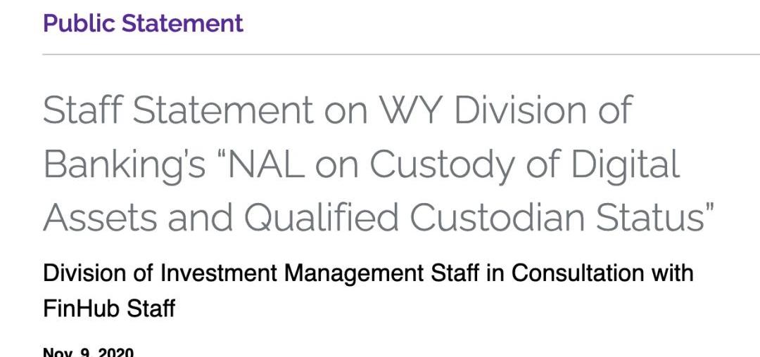 不起诉意见信,来源:STATEOFWYOMING,DEPARTMENTOFAUDIT紧接着,2020年11月9日,美国证券交易委员会SEC就该信给予了回复:称正在寻找能够成为“合格数字货币托管者”的机构。他们对“合格托管人”的以下几点特别有兴趣:持牌照的信托公司,是否有和委员会确定为合格托管人的金融机构有相似特征?如果有,到什么程度?持牌照的信托公司提供的托管服务,与银行、经纪人或者期货商的托管服务有何相同或不同?如果持牌照的信托公司担任了客户的数字资产或其他资产的托管人,在保护客户资产和加强安全性的哪些方面可能会有所空缺?一个咨询顾问如何根据《SEC托管规则》评估一个托管者是否合格?咨询顾问在寻找合格托管者的时候看重什么品质?这些品质是否随着资产类别的不同而改变?简而言之,相比于其他资产的托管,托管数字资产,需要具备哪些特殊资质?为什么?当前是否存在已经符合《SEC托管规则》定义但由于其未达到政策目标而不能被算入的机构?反之,是否有已被算入但未符合规则的机构?整体来看,SEC对于这封信件以及信中提及的“新型银行”的态度既积极,又谨慎。金融资产的托管本身在法律上就是一个难题,特别是在传统的资产和数字资产并行的当下,法律体系很难完善。“托管人”一词经常被滥用,而钻现有法律空子的机构也不在少数。所以,明确定义和责任,确实是对于金融监管者的头等大事。