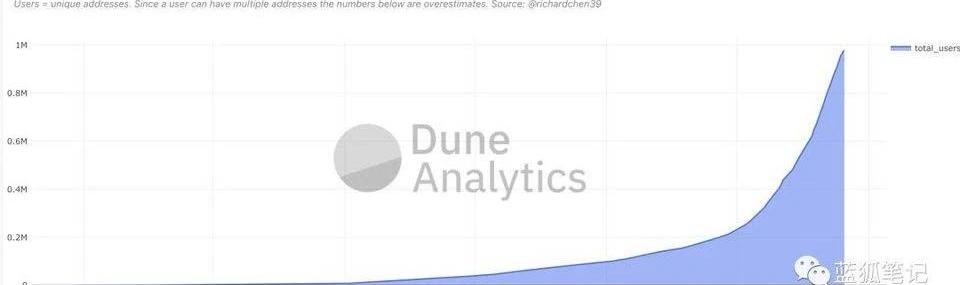 2017年以太坊基本上没有什么实质生态,2017年以太坊火的是首次代币发行。当时以太坊的主要用例就是首次代币发行的融资。当时几乎大多数的项目都只是概念,人们基于概念投资或投机。而这种泡沫来势迅猛,但去也汹涌。当然,2017年的泡沫并非一无是处。2017年的牛市让很多人看到区块链和以太坊的潜力,看到除比特币之外,还有其他区块链的机会。同时,在这个时期,有一些项目获得了融资,并坚持下来,为未来的以太坊生态繁荣打下基础。像Chainlink、Aave、MakerDAO、Kyber、Loopring等不少项目都是在那个时期获得了发展的资金。因此,2017年前后是以太坊生态的播种阶段。在疯狂的泡沫中,大多数项目烟消云散,一地鸡毛,但有一些优秀的团队,在以太坊的大地上播下了种子,并开始生根发芽。因为当时以太坊生态并没有实际的价值支撑,在疯狂的首次代币发行泡沫退去之后,随之而来的大规模下跌。经过了几年的探索,如今的ETH已经有了坚实的生态支撑。其中最大的支撑就是DeFi生态的形成,目前整体DeFi市值超过160多亿美元,有些协议有一定规模的用户、交易量和费用收益。而对于ETH本身来说,大多数DeFi协议都锁定了不同规模的ETH,ETH已经从融资媒介蜕变为底层的价值资产。如今DeFi对ETH形成强大需求:*DeFi中锁定的ETH总量达到660万个DeFi中锁定了大量的ETH,达到660万个,按照当前价值超过34亿美元。除了以太坊,DeFi整体锁定的资产量128亿美元。DeFi正在形成对ETH越来越大的需求,在Unswap上,流动性最好的是ETH,交易量最多依然是ETH。随着DeFi向纵深发展,例如去中心化期权等,ETH在DeFi中的需求只会越来越多。*DeFi生态的用户目前DeFi用户接近100万左右,这里包括DEX、借贷、衍生品、保险、稳定币、聚合器等等,这些都是真正在使用产品的用户。