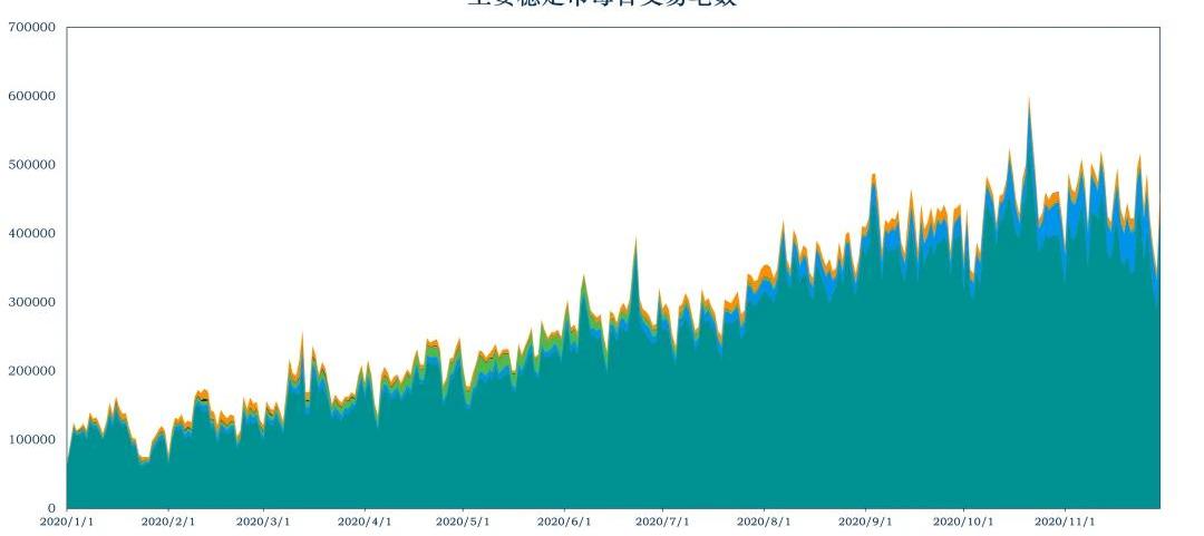 来源:MYKEY,CoinMetrics其中,主要的增长来自Tether。Tether累计增发24.13亿,具体为以太坊13.13亿,波场11.00亿。USDC的流通量增加0.33亿,于11月30日突破30亿美元大关。TUSD的流通量增加0.52亿,DAI的流通量增加1.24亿,突破10亿美元大关;PAX、BUSD、HUSD、GUSD的流通量分别减少0.26亿、0.18亿、0.36亿、141万美元。活跃地址数