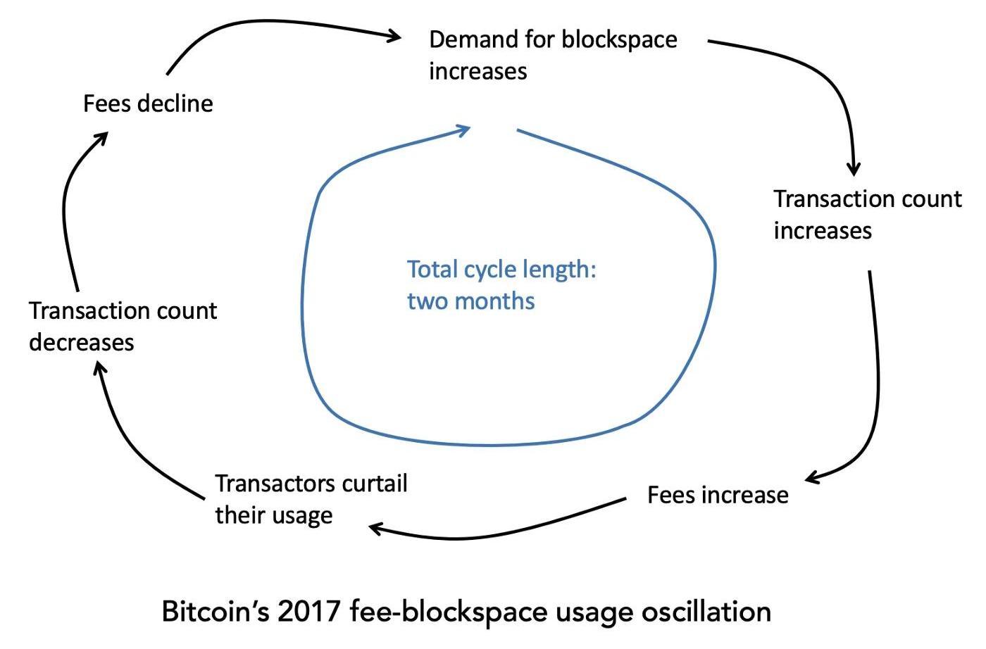 平均而言,手续费会在交易完成后约两周达到峰值。尽管整个年度都在上涨,但整个周期花费了两个月的时间。随着区块逐渐填满,新的少量交易将手续费推到了交易者无法接受的范围。当然,手续费只是现象,潜在的问题实际上是区块空间。