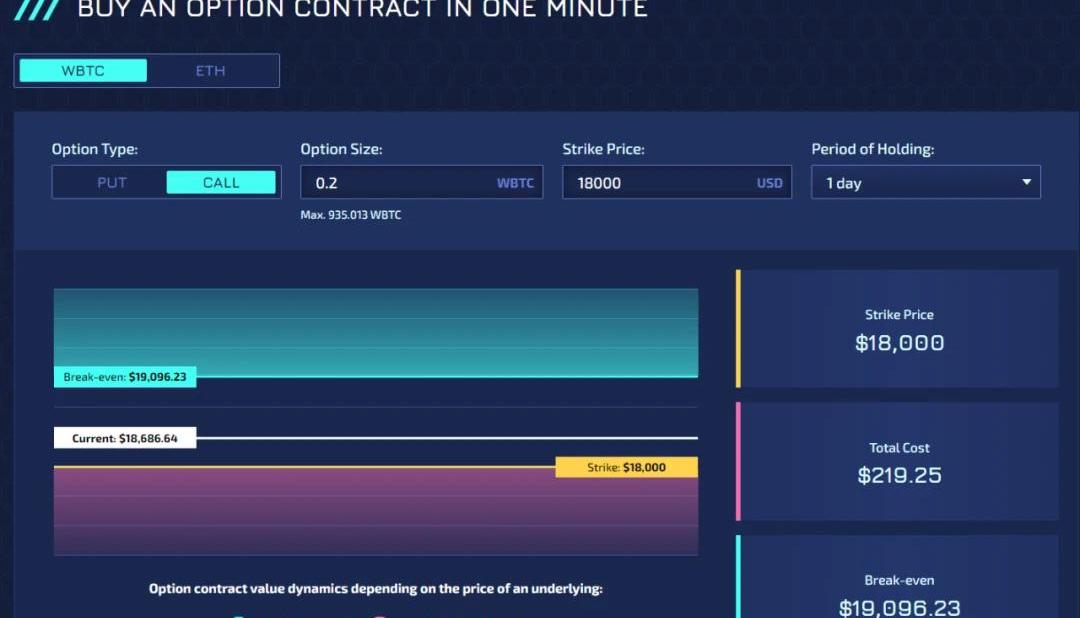 目前Hegic只提供了WBTC和ETH的期权购买服务。用户只需简单的点击即可完成期权类型、时间、价格等参数的设定,输入数据后将会自动显示费用,支付费用即可完成购买。Hegic的一个特色就是大幅简化了购买期权的复杂度,用户很容易就能够完成期权的购买,在设计上相比专业期权平台更加易于理解。