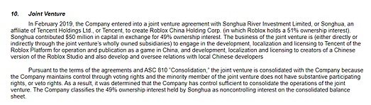 2019 年 2 月,Roblox与Songhua River Investment Limited(松花江投资有限公司,腾讯控股有限公司的关联公司)或腾讯签订合资协议,以创建 Roblox 中国控股公司(其中 Roblox 持有 51% 的所有权权益) ,松花出资 5000 万美元换取 49% 的所有权权益。合资公司的业务是(直接或通过合资公司的全资子公司间接)从事Roblox平台的开发、本地化和授权给腾讯在中国作为游戏运营和发布,以及开发、本地化和授权给中国版 Roblox Studio 的创作者,并发展和监督与中国当地开发商的关系。