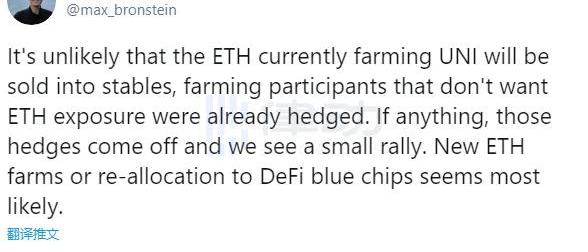编者按:本文来自区块律动BlockBeats,Odaily星球日报经授权转载。11月17日,Uniswap的初始性流动性挖矿即将结束,目前共有约价值32亿美元的资产锁仓在Uniswap中。参与Uniswap的流动性挖矿,用户收益大致分为两种:UNI的代币奖励和交易手续费分红。根据官方数据,Uniswap的手续费为千分之3,给流动性提供者的分红为万分之5。根据近两个月Uniswap总共近265亿美元的交易量来看,分红金额也不容小觑。那么或许会有部分用户为了手续费收益继续选择锁仓ETH,但是可以预见这部分用户应该不会很少,缺少了UNI代币奖励收益将会大大减少。结束流动性挖矿之后,对于Uniswap的影响必然是会损失一部分流动性。而挖矿结束之后,价值10亿美元ETH又将何去何从?不少加密用户和行业人士对此都发表了自己的看法。Coinbase机构研究人员MaxBronstein认为从Uniswap流动性挖矿中流出的ETH不太可能会被出售变成稳定币,不想接收ETH的流动性挖矿参与者已经进行了对冲。如果有什么不同的话,那就是这些套期保值措施消失了,我们会看到小幅反弹。新的ETH流动性挖矿会出现或将资产重新分配给DeFi蓝筹股似乎是最有可能的。