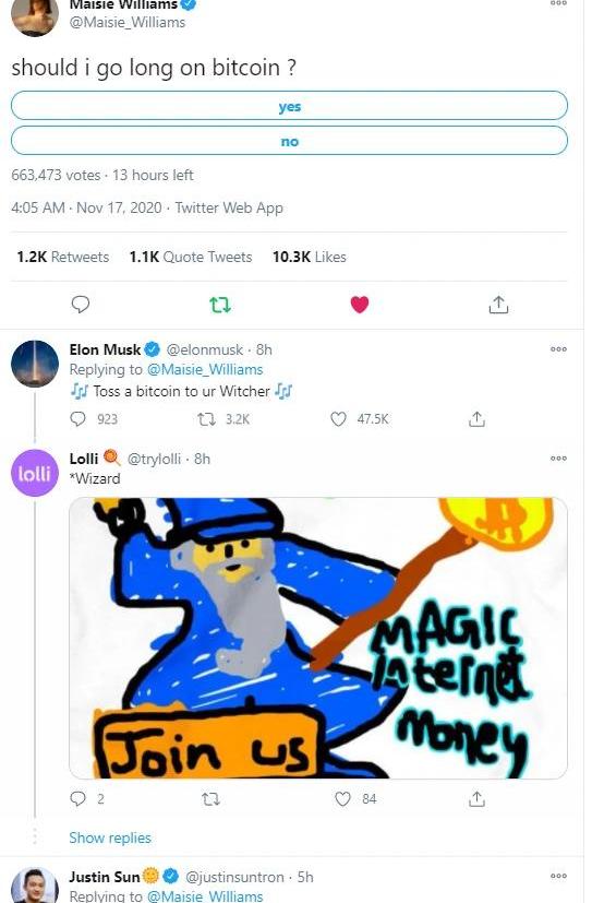 如果把这个coin换成比特币毫无违和感:未来某个时间,你要上船,说,我有美金,人家说,没地儿了,有美金没用。然后你想起了曾经大叔的话,你展示了你的比特币钱包,对方看到你有比特币,说:“你怎么会有……”然后你打断对方的话说:“longbitcoin”船长回复说:“shorttheworld”。然后船长说:“当然,你有一个单间。”因为《权力的游戏》中贾根给二丫的价值币的特性和比特币或者其他某些加密资产很像,上文中已经列举了四个特点:稀缺、身份认同、购买力、共识。所以,题目说二丫拿到的币其实就是比特币。本文略有调侃,旨在用大家熟悉的影视剧来讲解比特币的基本特性,回到文首,二丫的扮演者在推特发起投票要持有比特币,给我一种剧内外穿越的感觉。这种感觉很奇妙,因为当时看这个剧的时候,我看到帅大叔给二丫一个币说出那一句:“这是一个有价值的币”,突然就笑了起来。如果别人问起你比特币的特性,你说不清楚,可以回忆《权力的游戏》中二丫的币的几个特性,这么来回答,是没有问题的。