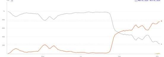 好不容易平静了一年,今年因为修改难度调节算法和强制征税等方案,领域再次出现意见分歧,社区形成核心开发团队BCHABC与BCHNode两大阵营。如果本月15日之前双方未能达成共识,比特币现金将再次分裂出两条链——BCHA和BCHN。不过从网络数据以及社区反应来看,比起前两次声势浩大的硬分叉大战,市场对于这次的纷争似乎不太感冒。BCH二次硬分叉在即,市场反应冷清