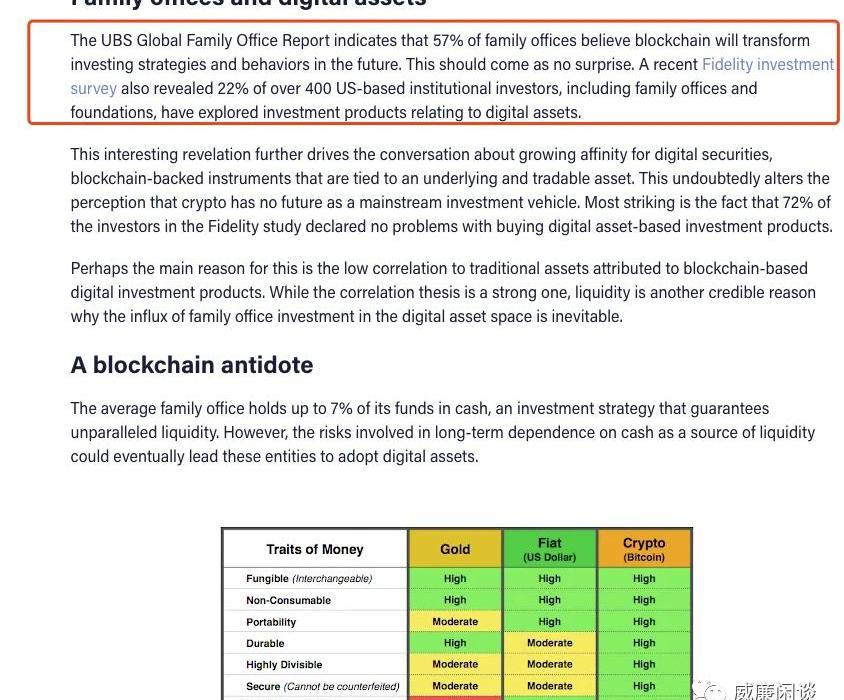 不得不说,真是有钱任性,会买会买。但是灰度并不是自己买的,他的比特币显然也是别人“帮”他买的。那么,到底是谁在“帮”灰度买?显然,答案就是两个字:机构。在灰度公开的报表中,我们很容易查到,他们的投资来源八成左右是来自机构和专业投资者。那么,到底是什么机构呢?抛开我们熟悉的加密领域的一些投资机构之外,或许还有一些养老基金等传统基金,但是有一个类别应该是大家比较想象不到的:家族办公室。而这个神秘类别被JP摩根报告揭露了冰山一角。昨天看到一篇报道,标题为《摩根大通报告:家族办公室现在可能将比特币视为黄金的替代品》: