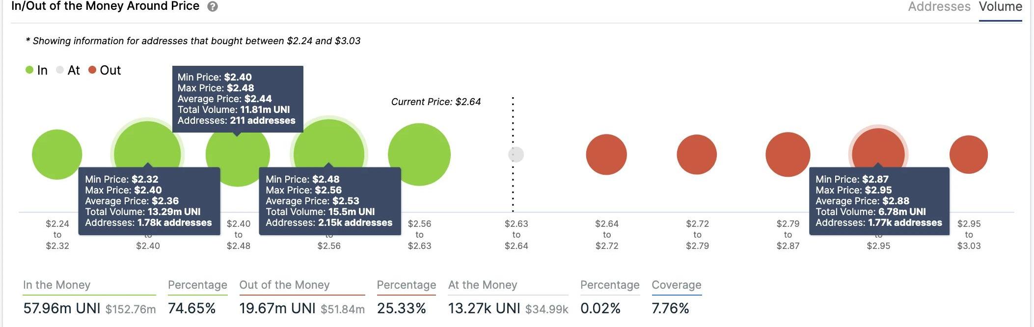 TradingView上的UNI/USD走势IntoTheBlock的IOMAP显示,大约1800个地址以2.87至2.95美元的价格购买了670万个UNI。因此,只有需求激增,该DeFi代币才能将200-四小时移动平均线转换为支撑位,才能确认价格将上涨至3.3美元或更高。