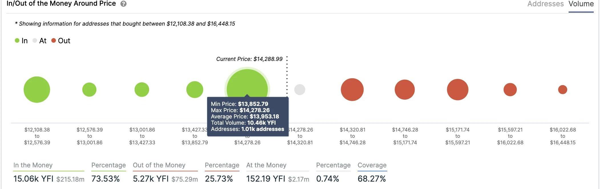 TradingView上的YFI/USD走势尽管对称的三角形可以形成连续的走势,但它们也可以形成逆转的上升趋势。为此,该DeFi代币必须打破支撑趋势线14,000美元。IntoTheBlock的IOMAP显示,在这个价格水平上,有1000多个地址持有近10500YFI。尽管这个巨大的兴趣区域可能会使价格继续下跌,但跌破该区域可能会导致价格下跌超过20%,达到11,000美元的支撑位。