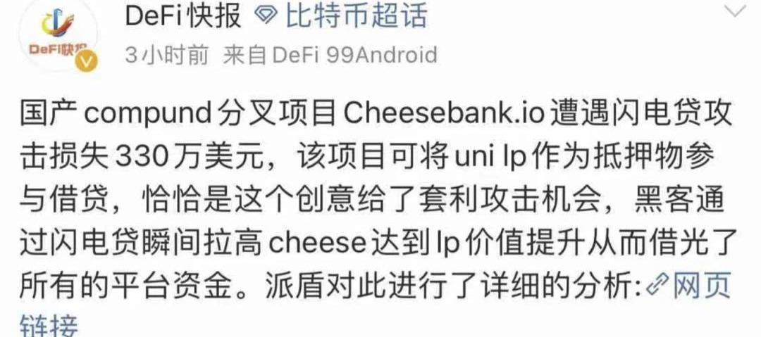 闪电贷,个人认为是DeFi发展的道路上的清道夫。在DeFi发展的道路上,一个好的想法和创意,在没有安全审核下,能吸引很多资金来玩,这点在DeFi流动性挖矿疯狂的时候已经得到验证了。当有安全审核就能保证安全吗?可能代码上没有漏洞,但各DeFi各协议之间存在经济上的漏洞。于是就给了闪电贷的套利空间。近期发生闪电贷的事情挺多,昨天就有两起,分别是:1)compound的分叉项目,被闪电贷攻击损失330万美元。