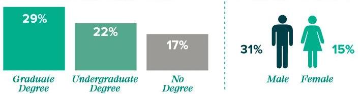从2019年至2020年,表示对比特币感兴趣和熟悉的投资者数量正在大幅增加,不过投资者的共同特征并没有发生变化。与对比特币不感兴趣的投资者相比,比特币投资更多的是有工作的年轻男性。对比特币感兴趣的投资者声称他们拥有更高的风险承受能力,也更有可能积极寻找新的投资机会,这些投资者持有多个投资账户,习惯阅读金融新闻。此外,投资者接受的正规教育越多,他们投资比特币的可能性就越大:29%的拥有研究生学位的投资者进行过比特币投资,而拥有本科学位的投资者只有22%进行过投资,没有大学学位的投资者只有17%进行过投资。