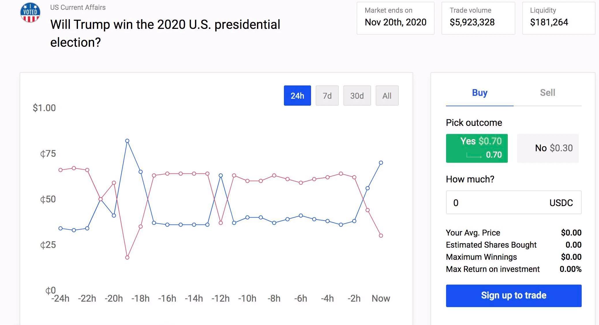 市场:“特朗普会赢得2020年美国总统大选吗?”是:$0.7否:$0.3