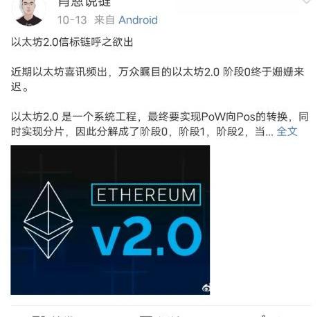 图片来源:微博笔者认为,从信标链运作原理、运作机制来看,信标链的诞生,可以有效推进现以太坊由PoW向PoS转变,促进以太坊的挖矿的公平机制,降低Gas费,减少挖矿成本。与此同时“矿工”向“验证者”身份的转变,也对矿工充满了吸引力,两条因素的结合或许将吸引更多矿工支持以太坊2.0的推进。而这一动向,有望推动以太坊代币的上涨,在寒冬中带来一波春色。但是,市场具有波动性,任何因素都将引起币价起伏,投资人仅可将技术更新作为参考因素一部分,投资需谨慎。