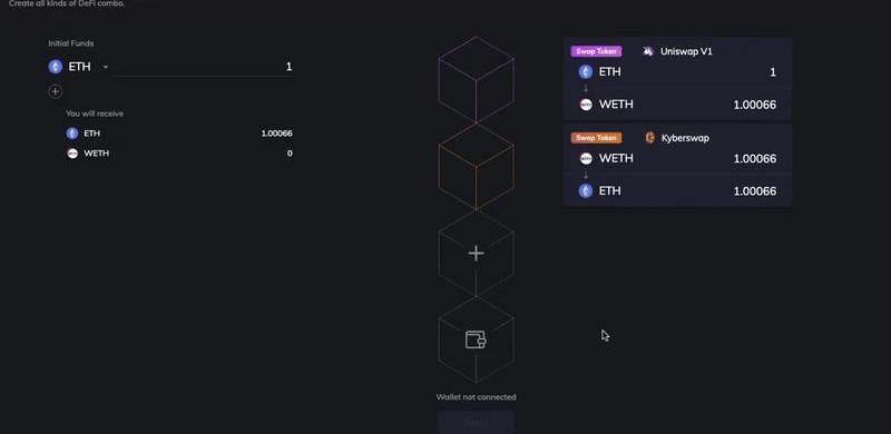 据官方介绍,其成交量以超过1亿美元。简而言之,对于不熟悉代码,但可以实现逻辑设计的用户,可以使用Furucombo无需代码直接设计实施相关DeFi操作组合。同时平台也可以简化用户使用流程,此部分内容会在Explore涉及。Furucombo页面基本介绍