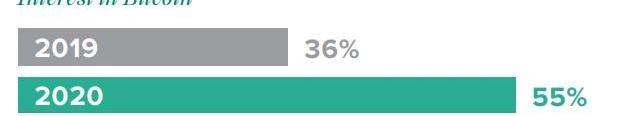 GrayscaleInvestment调研发现,人们对比特币的兴趣正在上升。2020年,有超过一半美国投资者对比特币感兴趣。2019年,有36%的受访者表示对比特币投资产品感兴趣,而今年这一数字有了显著增长,达到55%。