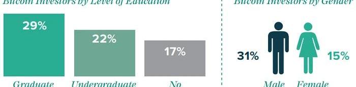 在2019年至2020年期间,尽管对比特币表现出兴趣的投资者、以及越来越熟悉比特币的投资者数量都大幅增加,但是这些投资者的“主要特征”仍然较为一致:1、与对比特币不感兴趣的投资者相比,热衷于投资比特币的大多是男性、年轻人和雇员;2、比特币投资者中,比例最高的人群年龄在25-34岁之间,这说明投资比特币的人还没有进入到“收入成熟”阶段;3、对比特币感兴趣的投资者大多也会寻找其他投资机会,他们具有“积极”的风险承受能力,不仅在多家公司持有持有投资账户,也非常关注消费金融行业的新闻热点;4、投资者接受的正规教育程度越高,他们投资比特币的可能性就越大,在拥有硕士研究所学位的投资者中,29%对比特币进行了投资;而在拥有大学本科学位的投资者中,22%对比特币进行了投资。值得一提的是,在所有比特币投资者中,只有17%的人没有拿到过高等学校学位;5、在已经投资了比特币的投资者中,男性数量是女性的两倍;6、在接受调研的女性投资者中,47%表示会考虑尝试比特币投资产品;7、在对比特币感兴趣的女性投资者中,66%表达了强烈投资愿望。
