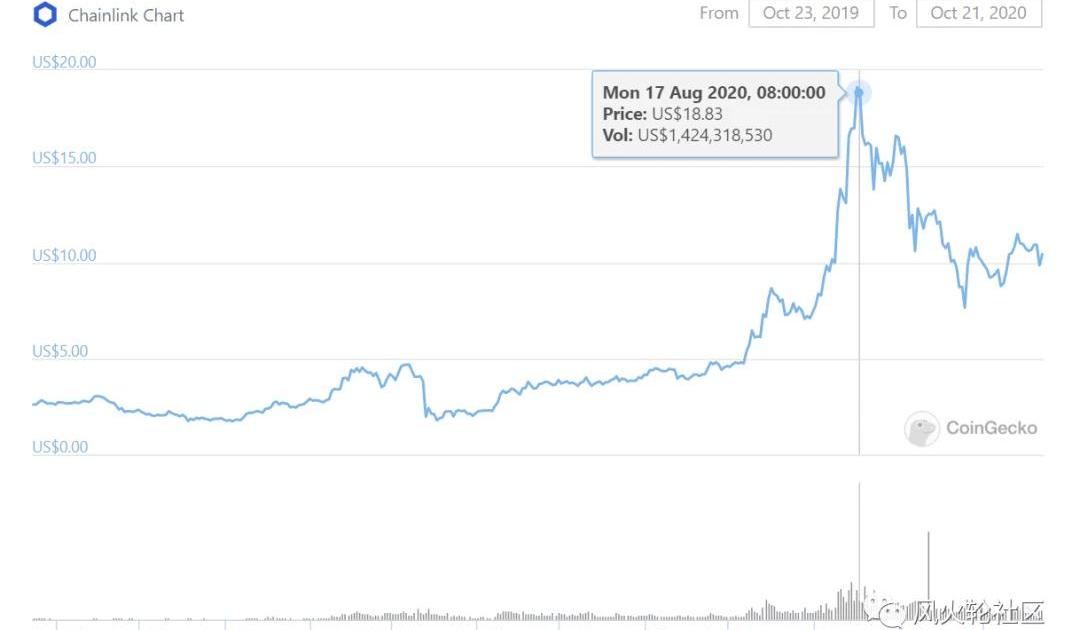 Link今年这一波的高点是在8月17日18.83U,和大饼还蛮巧合的,目前是10.43U: