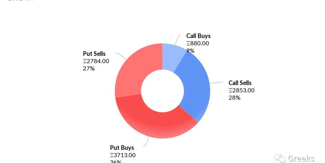 以太坊各期限IV相对稳定。这一轮龙头是比特币,以太坊在Defi加持下前期涨幅较大,本轮涨幅不及预期,以太坊IV一直在历史低位附近。今天CallBuys占比较少,其他成交力量接近,和昨天PutBuys无人问津形成鲜明对比。