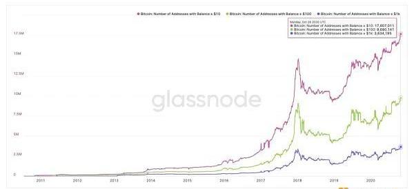 编者按:本文来自金色财经,Odaily星球日报经授权转载。恍惚间,比特币价格已经飙升至13,740美元,创下了今年的新高。比特币后续发展如何?我们从一下一组数据来看。比特币散户投资地址数量创历史新高随着BTC的价格近乎指数级地上涨,加密货币的散户投资数量也开始飙升,同样创下了历史最高水平。根据Glassnode收集的数据,持有至少10美元、100美元和1000美元比特币的钱包地址总数已接近3100万,创历史新高。这对于BTC来说是一个重要的里程碑。这也表明,机构不再是独行侠,散户投资者的认可和接受程度也越来越高。